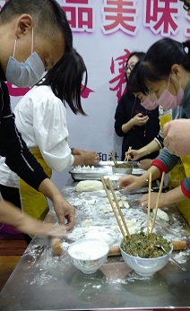 捏餃子比賽也在緊張激烈的進(jìn)行著,她揉面,你搟皮,我裝餡忙而不亂,女神、男神一起動(dòng)手。