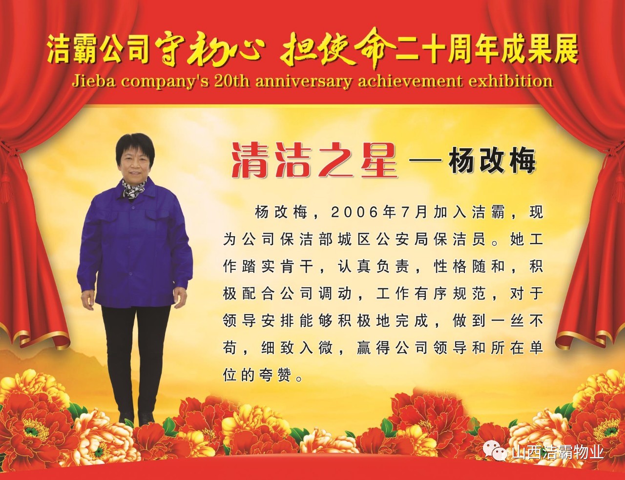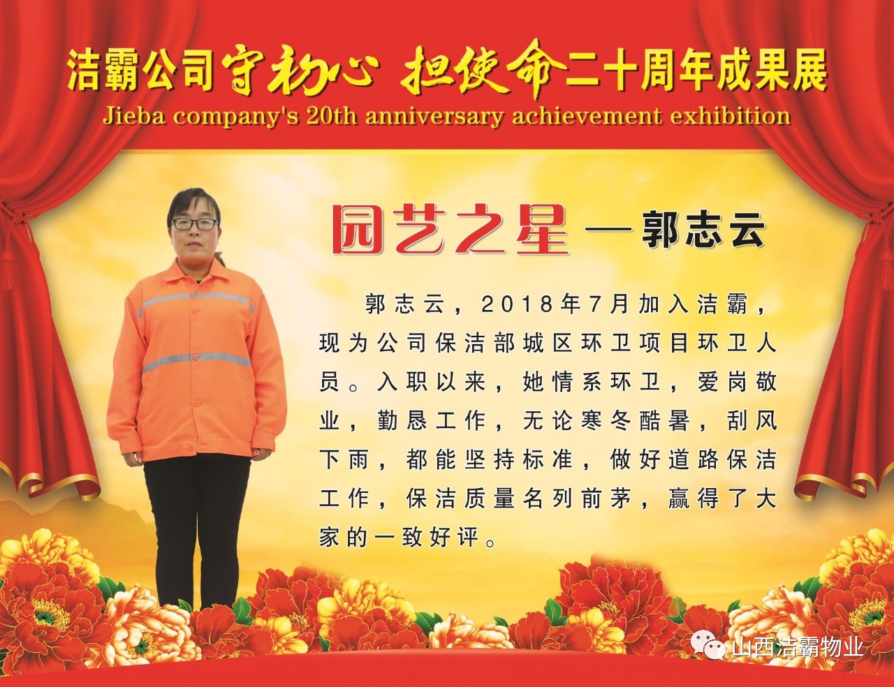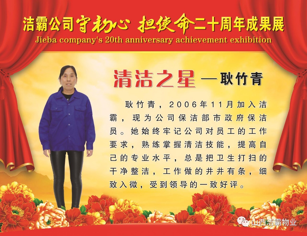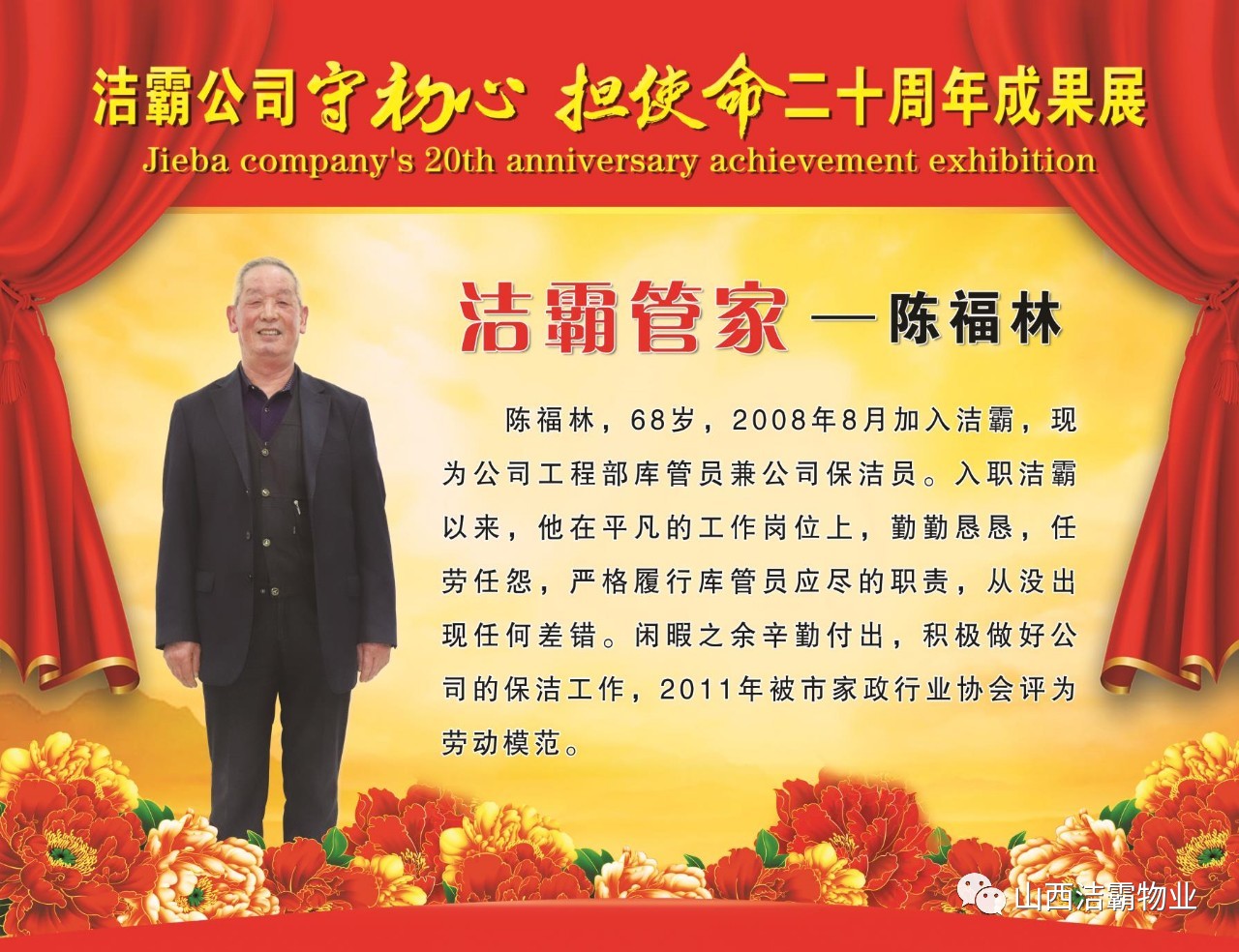 本次晚會(huì)以“潔霸二十華彰,感恩共創(chuàng)輝煌”為主題,此次慶典的核心思想是“感恩”,主要角色是潔霸的創(chuàng)業(yè)者。為此,公司對(duì)入職潔霸的創(chuàng)業(yè)功勛和一線員工進(jìn)行了表彰獎(jiǎng)勵(lì)。本次晚會(huì)共設(shè)8個(gè)獎(jiǎng)項(xiàng),包括“潔霸先鋒”“奉獻(xiàn)之星”“管理之星”“潔霸管家”“潔霸工匠”“清潔之星”“潔霸衛(wèi)士”“園藝之星”等。他們是:李山虎、張永智、史志霞、陳福林、王紅軍、余艷青、劉二丑、成艷粉、楊改梅、王書玲、張國(guó)榮、耿竹青、張粉霞、宋秋苗、陳先梅、張晉平、張偉山、趙瑞軍、王廣平、郭志云。晉城市原副市長(zhǎng)成育廷、晉城市商務(wù)局原局長(zhǎng)王新善、晉城市非公和社會(huì)組織工委書記郎軍芳、晉城市婦聯(lián)三級(jí)調(diào)研員李蓮菊、晉城市總工會(huì)商貿(mào)輕紡煙草服務(wù)業(yè)工會(huì)主席張玉濤、晉城市城區(qū)財(cái)政局局長(zhǎng)翟明太等領(lǐng)導(dǎo)為他們頒獎(jiǎng)。