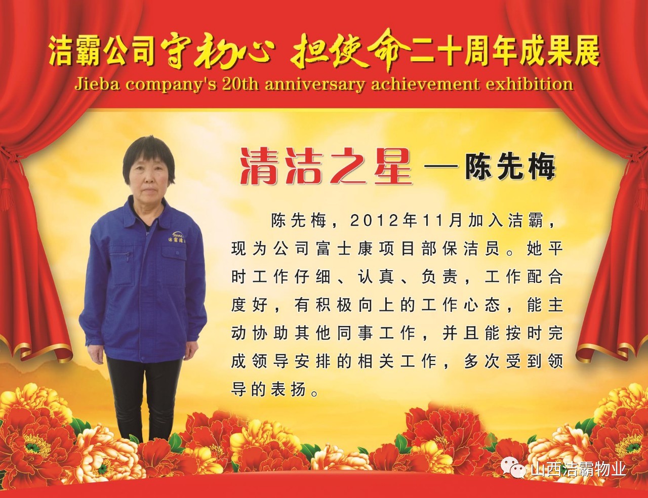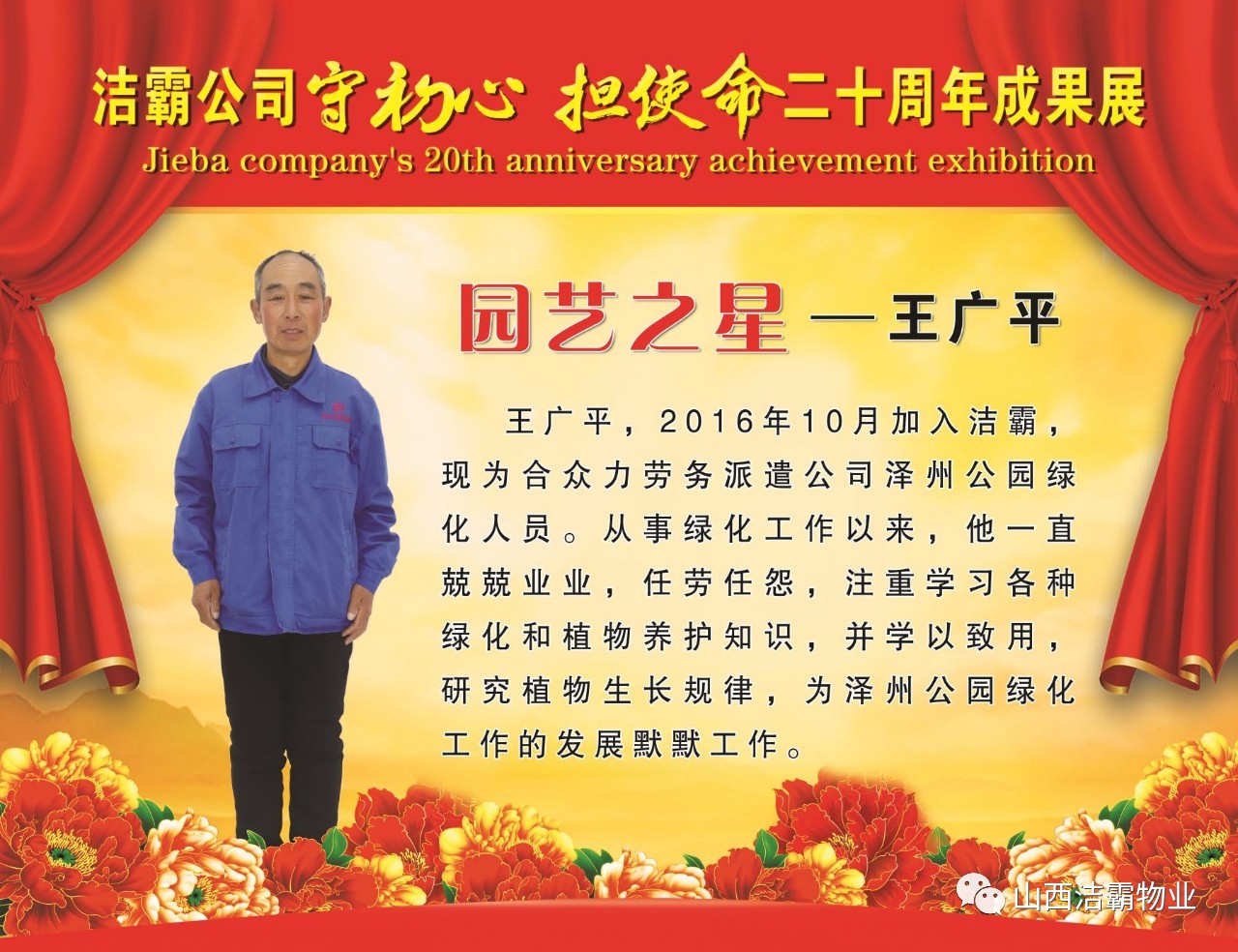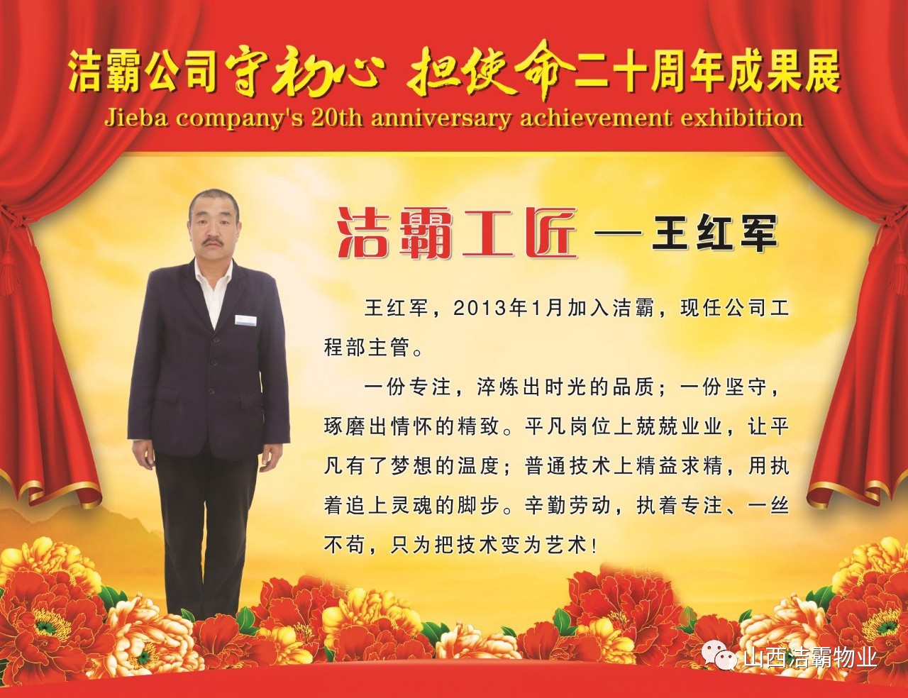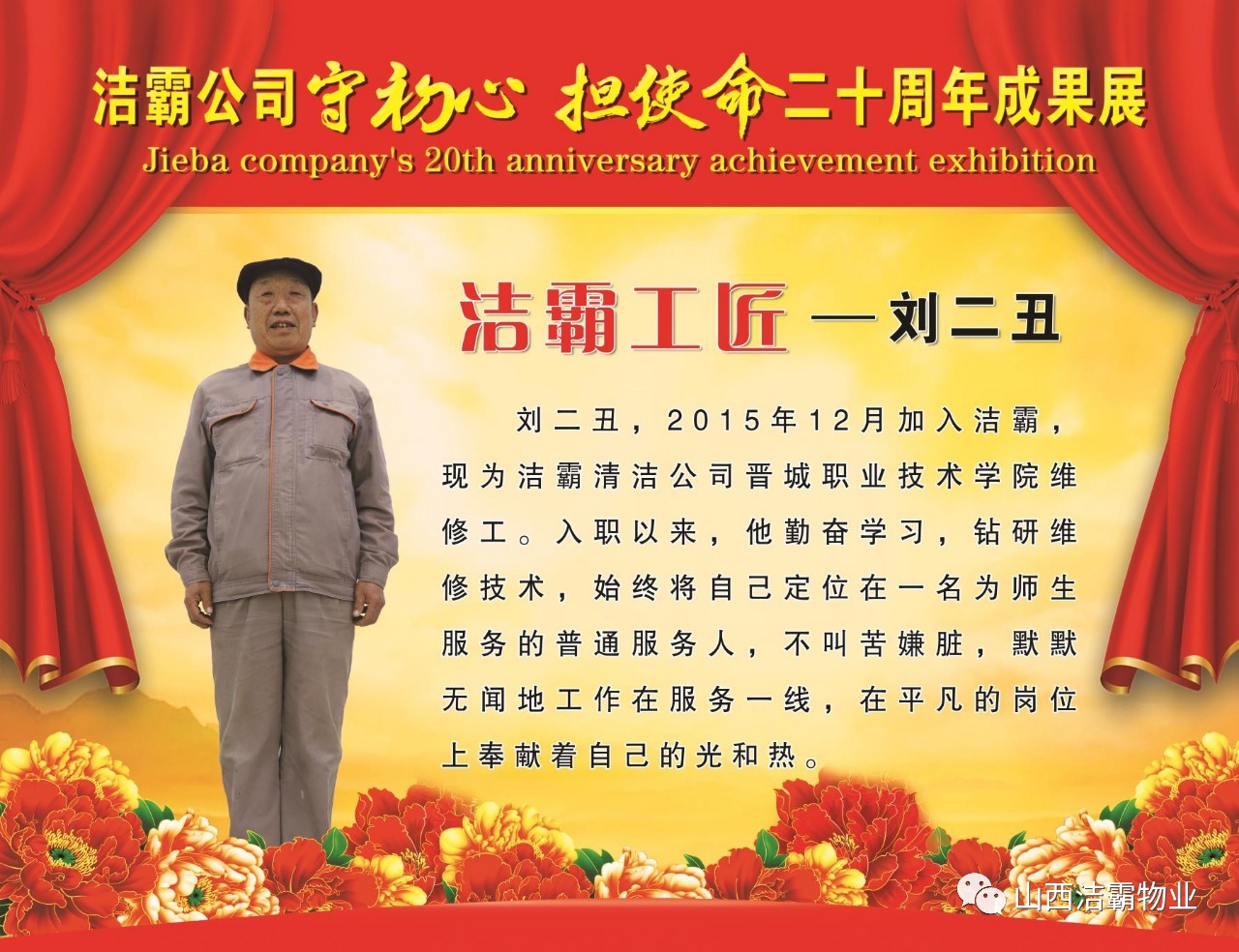 本次晚會(huì)以“潔霸二十華彰,感恩共創(chuàng)輝煌”為主題,此次慶典的核心思想是“感恩”,主要角色是潔霸的創(chuàng)業(yè)者。為此,公司對(duì)入職潔霸的創(chuàng)業(yè)功勛和一線員工進(jìn)行了表彰獎(jiǎng)勵(lì)。本次晚會(huì)共設(shè)8個(gè)獎(jiǎng)項(xiàng),包括“潔霸先鋒”“奉獻(xiàn)之星”“管理之星”“潔霸管家”“潔霸工匠”“清潔之星”“潔霸衛(wèi)士”“園藝之星”等。他們是:李山虎、張永智、史志霞、陳福林、王紅軍、余艷青、劉二丑、成艷粉、楊改梅、王書玲、張國(guó)榮、耿竹青、張粉霞、宋秋苗、陳先梅、張晉平、張偉山、趙瑞軍、王廣平、郭志云。晉城市原副市長(zhǎng)成育廷、晉城市商務(wù)局原局長(zhǎng)王新善、晉城市非公和社會(huì)組織工委書記郎軍芳、晉城市婦聯(lián)三級(jí)調(diào)研員李蓮菊、晉城市總工會(huì)商貿(mào)輕紡煙草服務(wù)業(yè)工會(huì)主席張玉濤、晉城市城區(qū)財(cái)政局局長(zhǎng)翟明太等領(lǐng)導(dǎo)為他們頒獎(jiǎng)。
