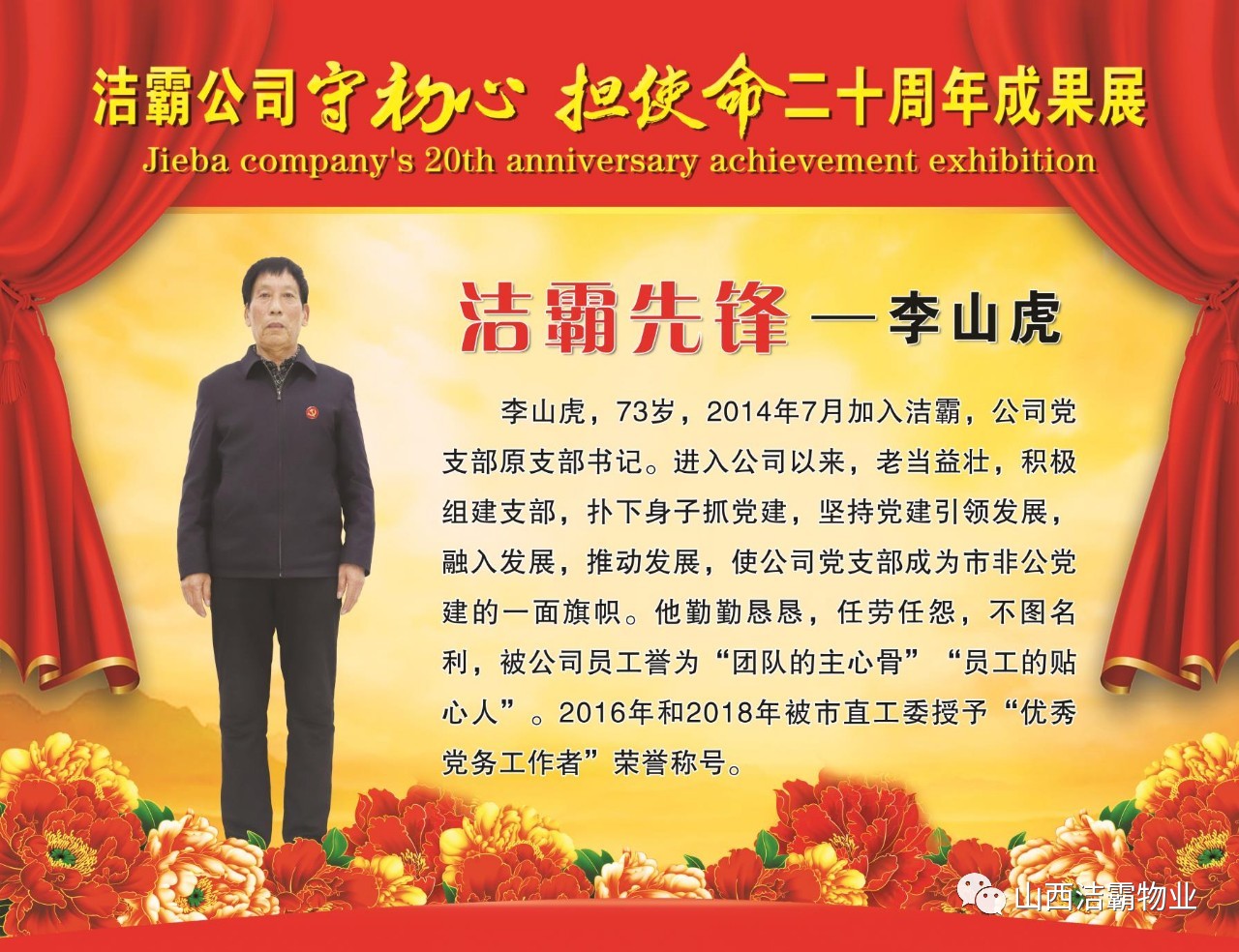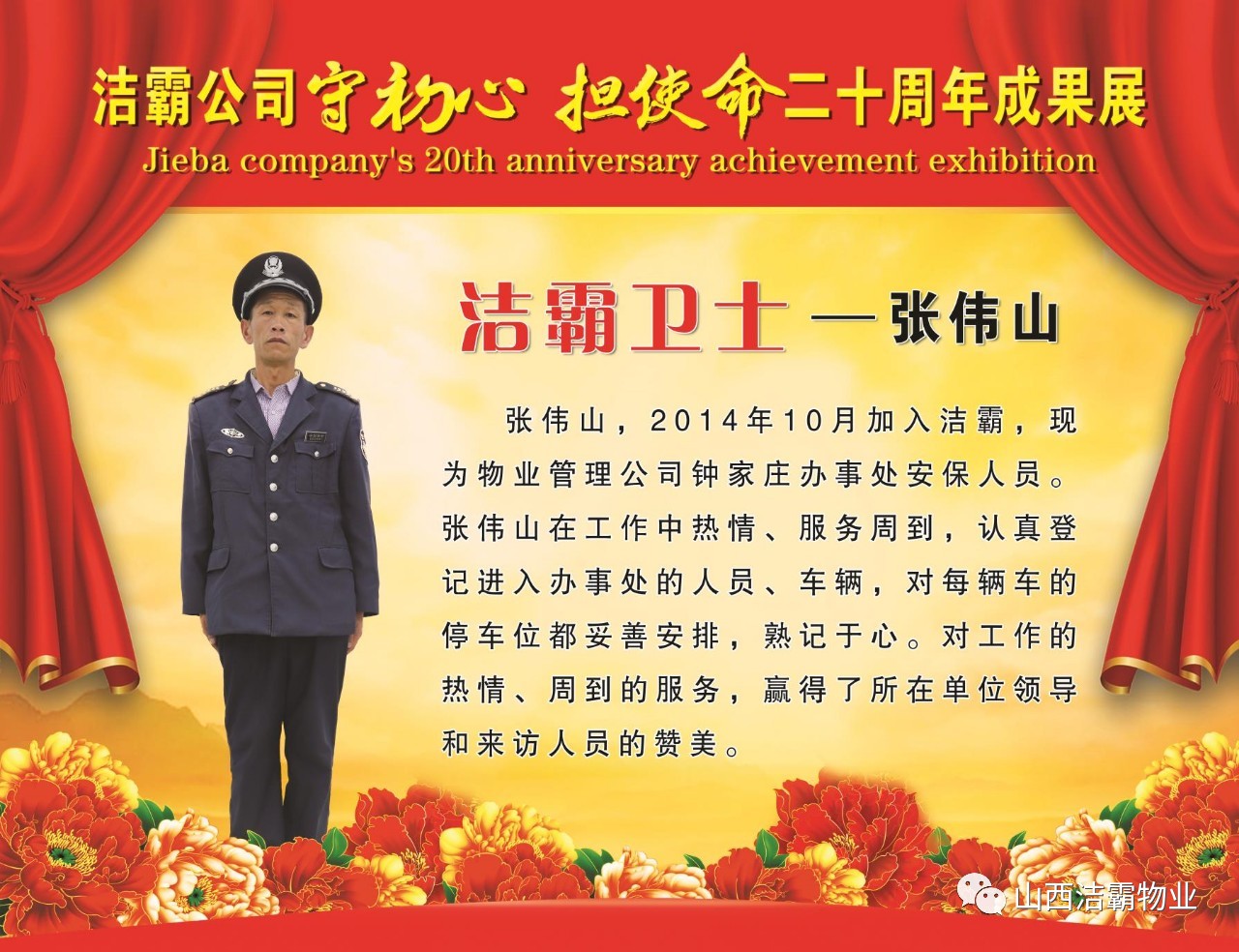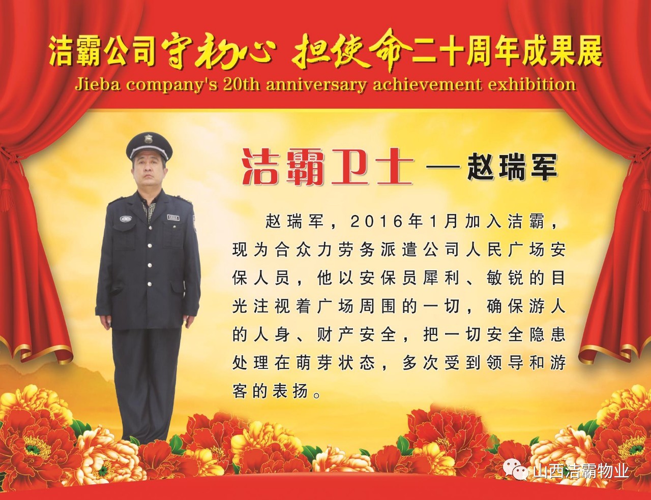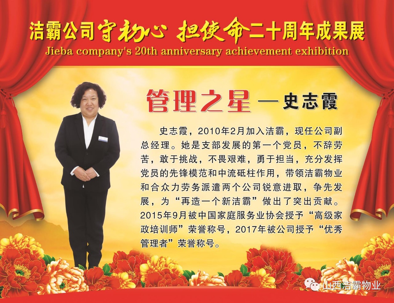 本次晚會(huì)以“潔霸二十華彰,感恩共創(chuàng)輝煌”為主題,此次慶典的核心思想是“感恩”,主要角色是潔霸的創(chuàng)業(yè)者。為此,公司對(duì)入職潔霸的創(chuàng)業(yè)功勛和一線員工進(jìn)行了表彰獎(jiǎng)勵(lì)。本次晚會(huì)共設(shè)8個(gè)獎(jiǎng)項(xiàng),包括“潔霸先鋒”“奉獻(xiàn)之星”“管理之星”“潔霸管家”“潔霸工匠”“清潔之星”“潔霸衛(wèi)士”“園藝之星”等。他們是:李山虎、張永智、史志霞、陳福林、王紅軍、余艷青、劉二丑、成艷粉、楊改梅、王書玲、張國(guó)榮、耿竹青、張粉霞、宋秋苗、陳先梅、張晉平、張偉山、趙瑞軍、王廣平、郭志云。晉城市原副市長(zhǎng)成育廷、晉城市商務(wù)局原局長(zhǎng)王新善、晉城市非公和社會(huì)組織工委書記郎軍芳、晉城市婦聯(lián)三級(jí)調(diào)研員李蓮菊、晉城市總工會(huì)商貿(mào)輕紡煙草服務(wù)業(yè)工會(huì)主席張玉濤、晉城市城區(qū)財(cái)政局局長(zhǎng)翟明太等領(lǐng)導(dǎo)為他們頒獎(jiǎng)。