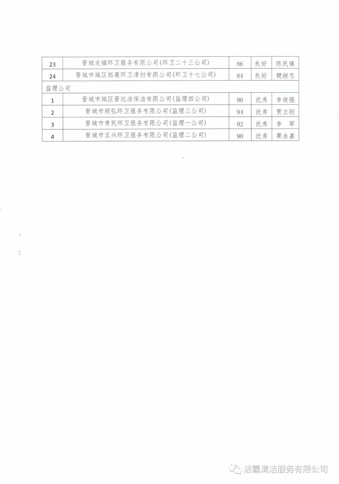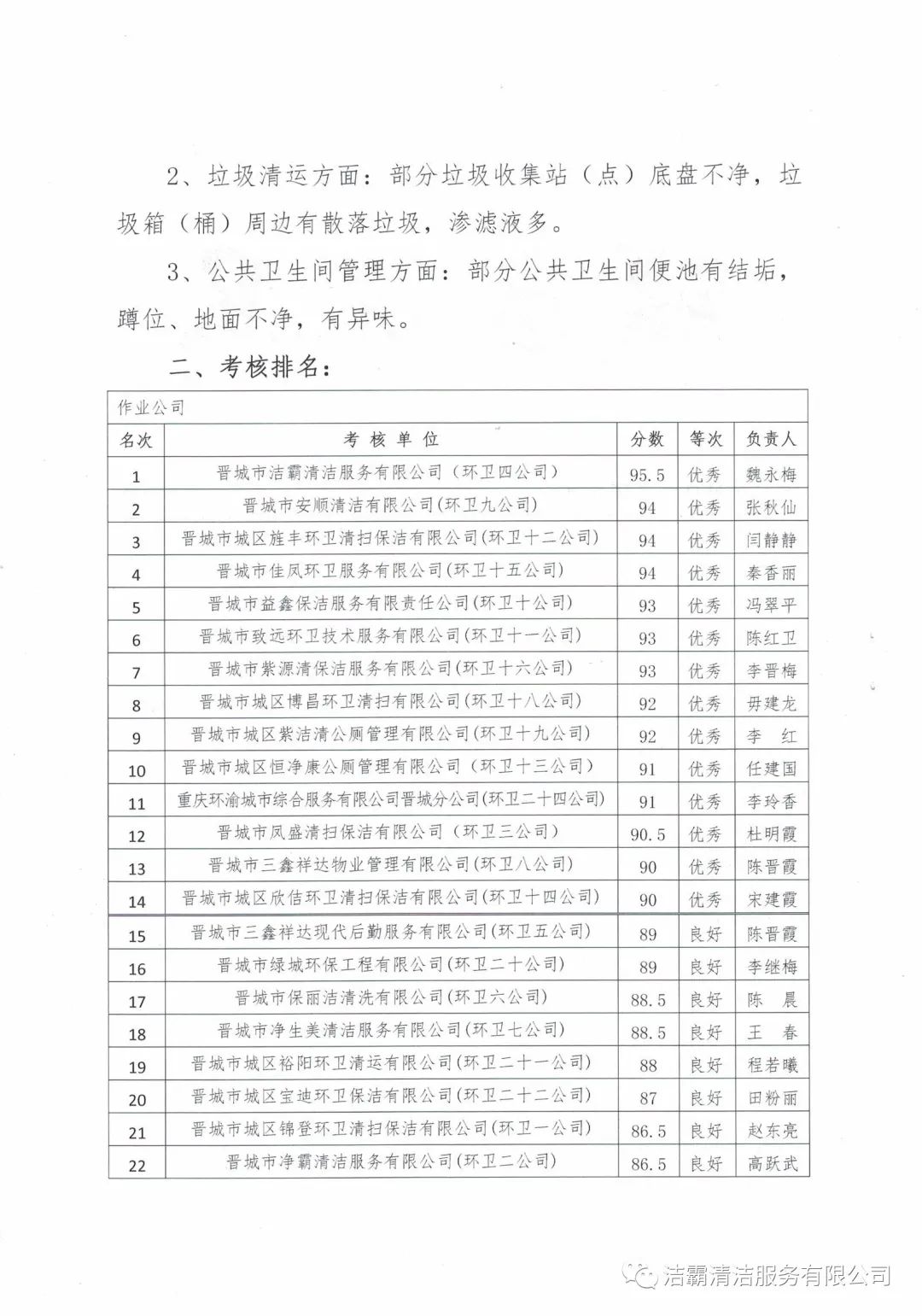 2020年10月28日—10月30日,晉城市城區(qū)市容環(huán)衛(wèi)中心由中心督查室牽頭組織,中心班子成員分別帶隊(duì),機(jī)關(guān)全體人員參加,對各作業(yè)公司道路清掃路段、垃圾收集站(點(diǎn))和公廁采用交叉檢查和隨機(jī)抽查的方式對24個作業(yè)公司的環(huán)境衛(wèi)生作業(yè)質(zhì)量和4個監(jiān)理公司的日常檢查情況進(jìn)行了考核。晉城市潔霸清潔服務(wù)股份有限公司所屬的環(huán)衛(wèi)四公司分?jǐn)?shù)最高,名列第一。