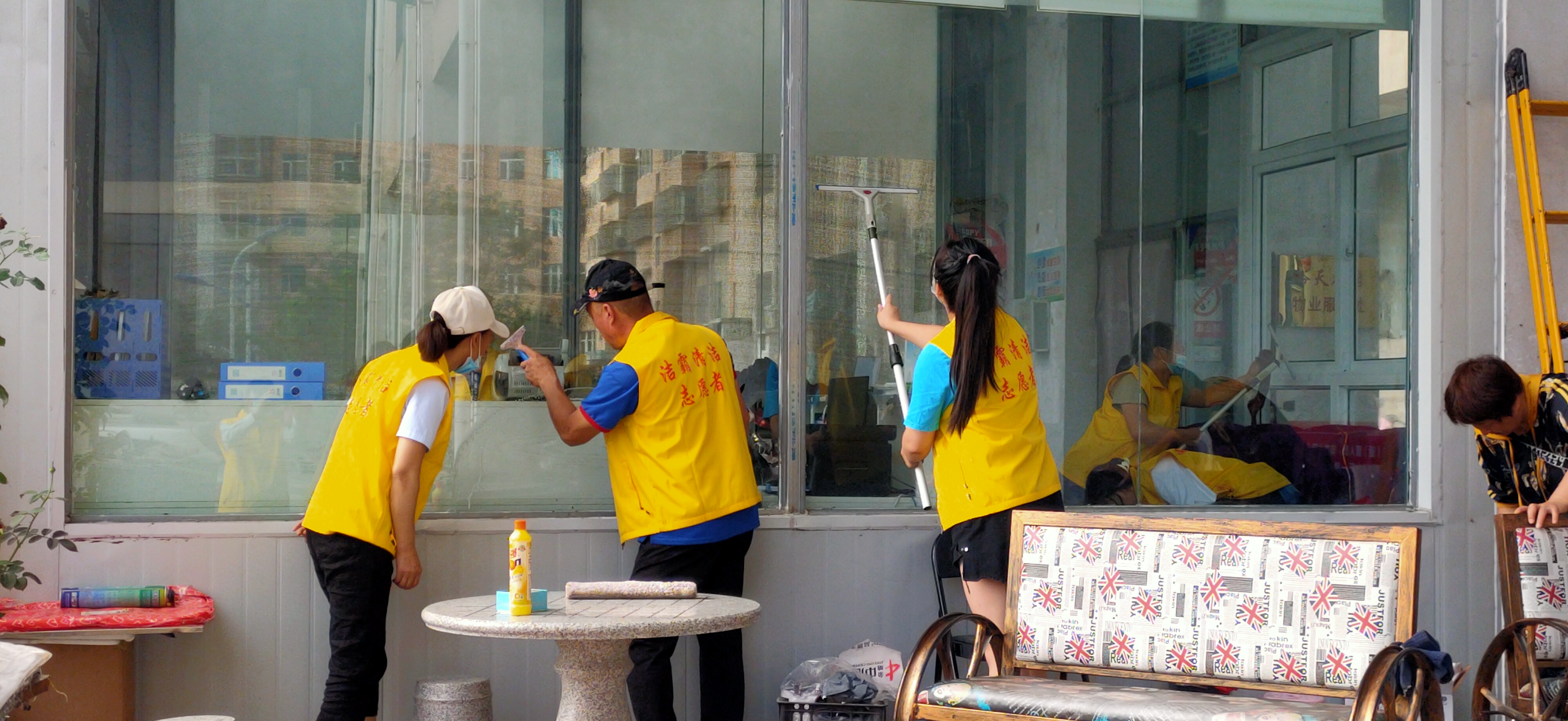 活動現(xiàn)場,志愿者身穿黃色馬甲,自帶玻璃擦、毛巾、笤帚、簸箕等清潔工具,對小區(qū)物業(yè)服務處及小區(qū)環(huán)境進行清潔打掃。他們有的清掃小區(qū)天臺上的垃圾;有的清理樓道門及公共設施上的牛皮癬;有的擦拭門衛(wèi)的玻璃;有的清洗紗窗;有的清洗物業(yè)服務處的玻璃幕墻……志愿者個個干勁十足,不怕臟、不怕累,經過一個多小時的團結協(xié)作,小區(qū)環(huán)境煥然一新。