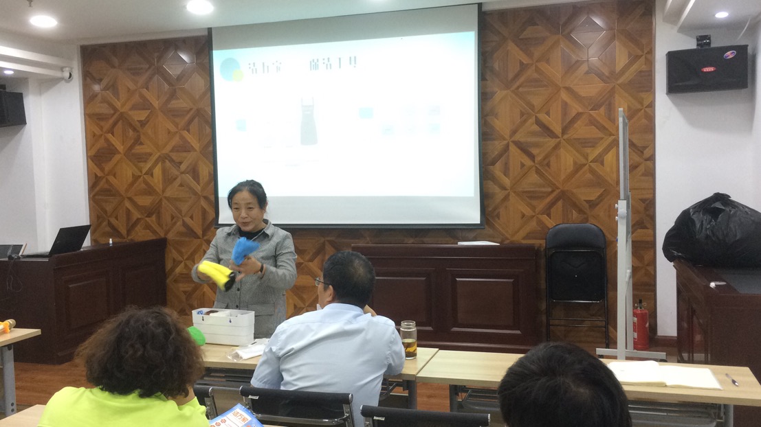 會議開場,從福建福州取經(jīng)回來的人力資源部呂利清用簡短的一句話首先點出了“潔萬家”產(chǎn)品的亮點——“1人1次4小時日常保潔服務(wù)”,接著她從服務(wù)人員、服務(wù)時間、服務(wù)內(nèi)容、保潔工具、保潔流程等方面介紹了“潔萬家”日常保潔與年關(guān)保潔以及居家保潔的區(qū)別,并對服務(wù)內(nèi)容所涵蓋的6大區(qū)域(臥室、衛(wèi)生間、餐廳、客廳、廚房、陽臺)以及專用8色保潔布的分類使用進行了詳細的介紹。