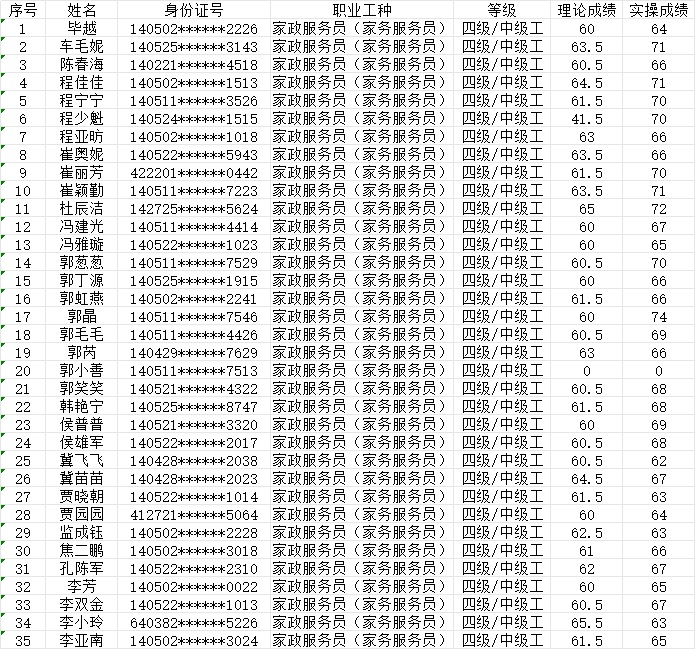 晉城市潔霸清潔服務(wù)股份有限公司職業(yè)技能等級(jí)認(rèn)定中心現(xiàn)將2024年1月14日認(rèn)定人員成績(jī)公示如下: