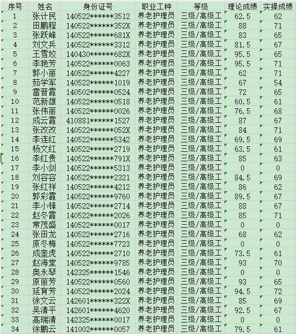 2024年5月20日下午第14批養(yǎng)老護理員高級認定人員成績公示