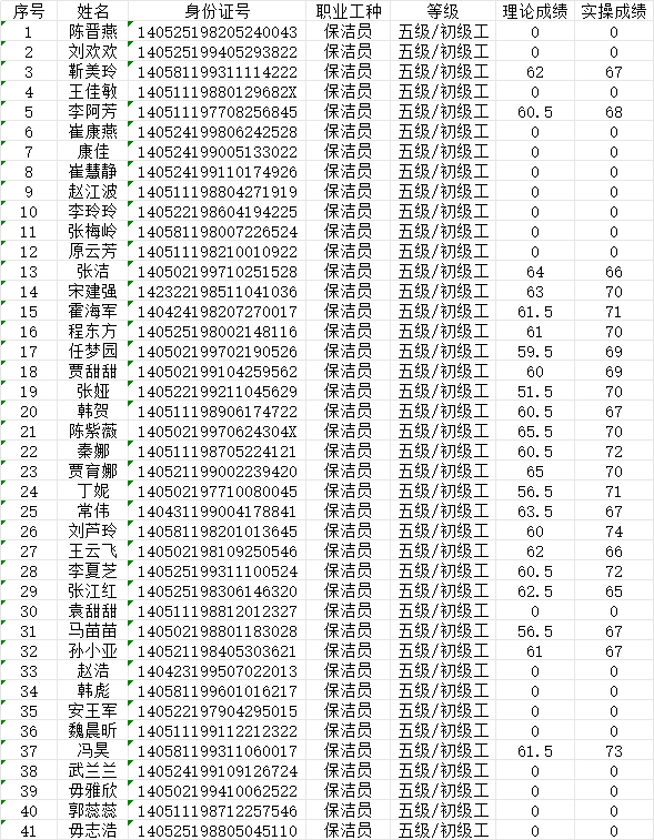 晉城市潔霸清潔服務(wù)股份有限公司職業(yè)技能等級認(rèn)定中心現(xiàn)將2024年8月4日認(rèn)定人員成績公示如下: