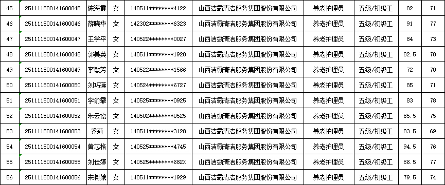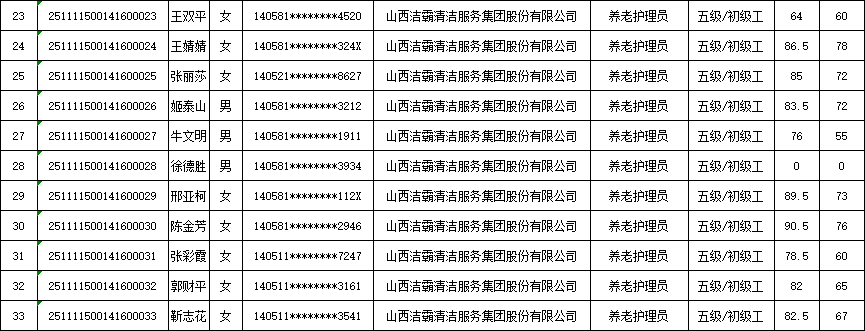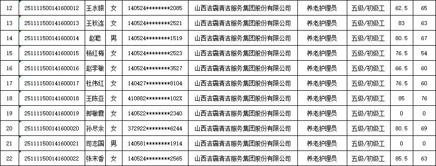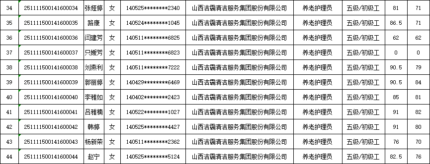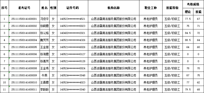 山西潔霸清潔服務(wù)集團(tuán)股份有限公司職業(yè)技能等級(jí)認(rèn)定中心現(xiàn)將2025年11月15日認(rèn)定人員成績(jī)公示如下: